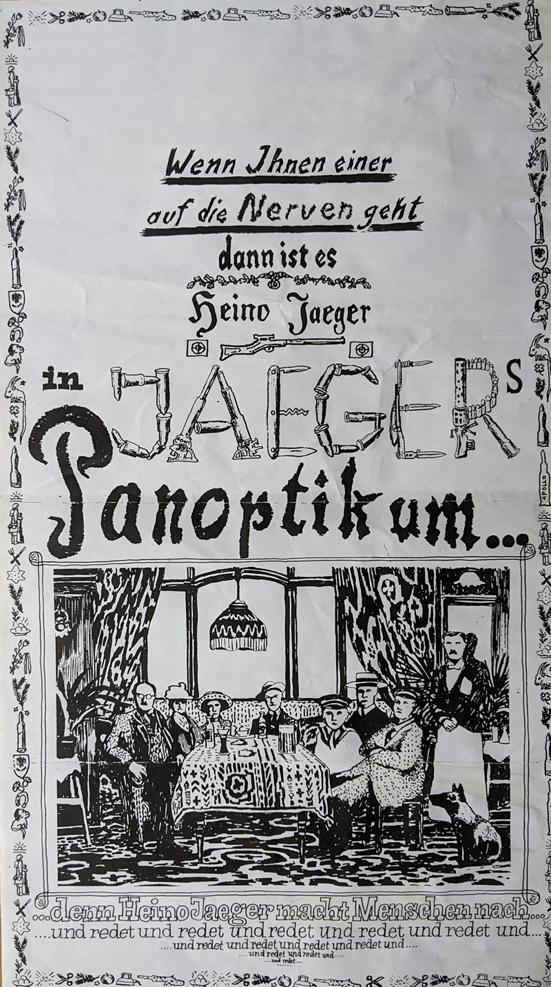Heino Jaeger konnte und wollte nichts ernst nehmen. Alles war komisch.“ So hörte er sich z.B. gerne Hitler-Reden an, fand sie komisch und strapazierte danach seine Umgebung stundenlang mit den absurdesten Hitler-Monologen.