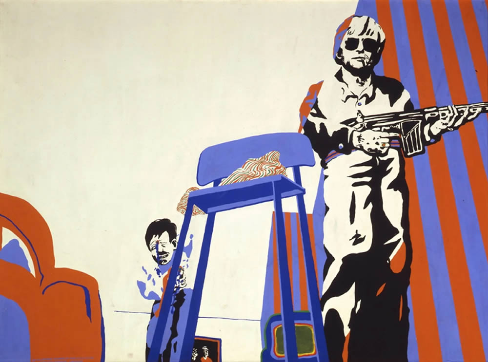 Ich liebe das Leben“, so ein zynischer Titel eines Bildes von 1967, in dem rechts oben ein Killer durch eine Wohnzimmertüre schreitet, vor ihm auf weißem Grund eine Leiche in einer roten Blutlache, links auf einer Wolke ins Nirwana schwebend ein junger Mann, aus dessen Pulsadern Blut rinnt. Rechts unten im Bild tropft gleichgültig der Wasserhahn der Zeit: Das Leben geht weiter!