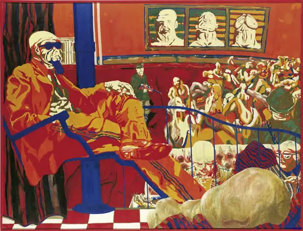 Zielscheiben tauchen auf, Gewehrläufe, ein Kopf mit Einschusslöchern, anonyme Fleischklumpen und amputierte Körperteile, Uniformierte, und immer wieder Wohnzimmer mit Sessel und Sofa als Metapher des gesetzten Bürgertums. „Ende schön alles schön“ heißt so ein Bild von 1967.